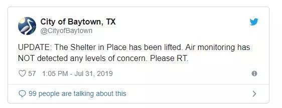 據(jù)Baytown市稱,截至下午3:05,為居住在工廠西部和330以南的居民發(fā)放的住房已經(jīng)取消,空氣監(jiān)測沒有發(fā)現(xiàn)任何關(guān)注程度。